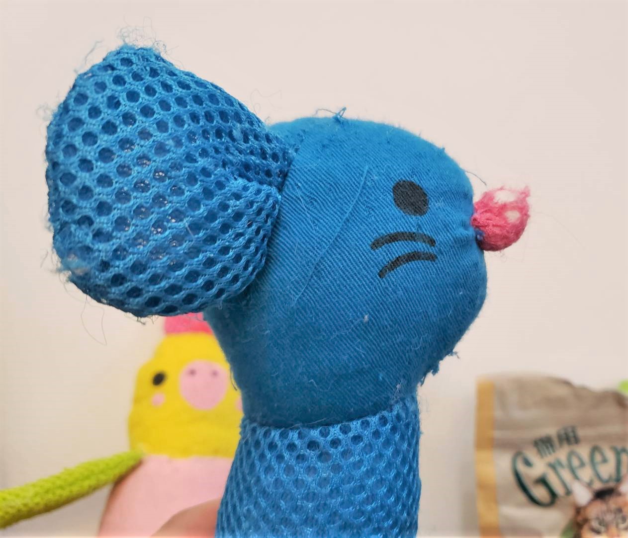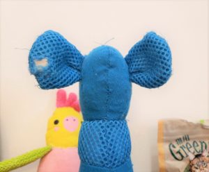 噛みすぎて、布の継ぎ目やメッシュ素材が破け、胴体の部分は歯の穴で穴ぼこだらけでしたが、何度も補修しては使い、今もおもちゃBOXにスタンバイしております。