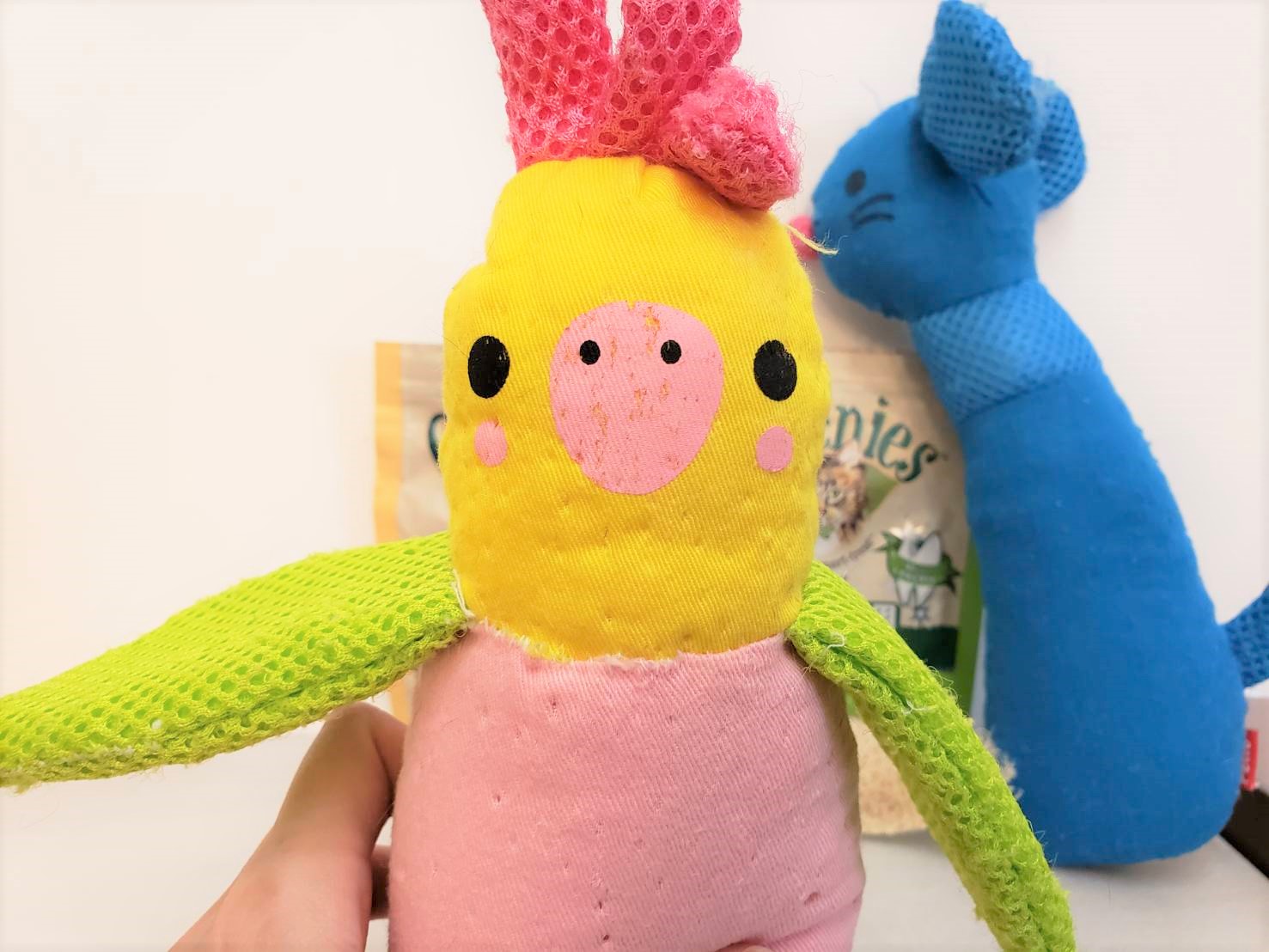 こちらはストレス発散用の蹴りぐるみですが、羽の部分と頭の先の部分がメッシュ素材になっていて、そこを噛み噛みするとデンタルケアにもなるという蹴りぐるみです。