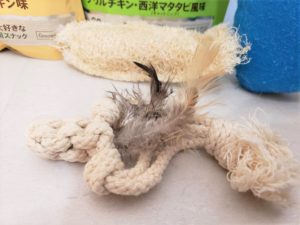 ヘチマ素材の方は、飾りの紐がついており飲み込むと危ないので最初から外してノア様に献上しました。一瞬でヘチマ素材がボロボロに噛み千切られ、ヘチマのくずが出るので早々に撤収しました(笑)
