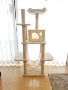 そんなこんなで、こだわりの強いおマロ様にはボウル型爪とぎを気に入ってもらえなかったので、他に気に入ってもらえそうなものをいくつか購入しました。番外編にもなりそうですが、まず爪とぎにもなるキャットタワーを用意しました。