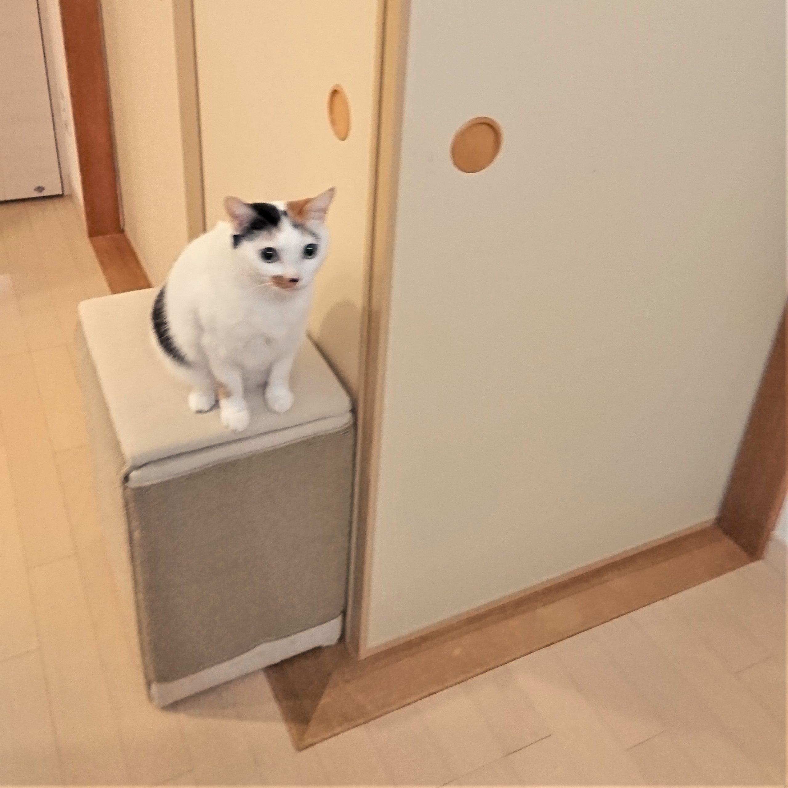 しっかりとした木枠のBOXなので、蓋を開ける際はそれなりの重さがあるのでお猫様自身で蓋を開けることができません。なので、遊んでほしい時は写真のように蓋の上でごろにゃんアピールしてきます。